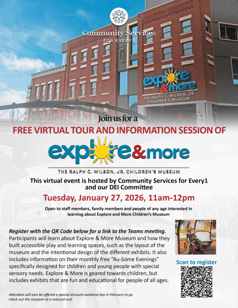 Join the DEI Committee for a quick virtual picture “tour” and information session on Tuesday, 1/27 at 11am with Val Drapeau, Director of Education, about accessible play and learning for people of all abilities and ages at Explore & More- The Ralph C. Wilson Children’s Museum. Share this event with your staff, with families you support or anyone interested! We’ve invited our peer agencies involved in some DDAWNY Committees as well. All interested should register using the QR code on the flyer to access the Teams link and to receive a follow-up email after the event with museum information and details about the discount day in February.